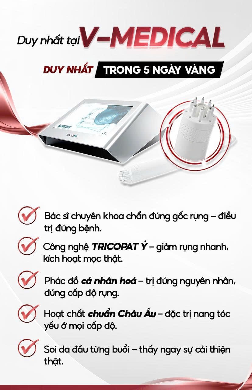 Trong điều trị rụng tóc và cấy tóc hiện đại, điều quan trọng không chỉ là tạo sợi tóc mới, mà là phục hồi đúng nền nang tóc, để tóc có thể mọc khỏe và duy trì lâu dài. Đây cũng chính là lý do V-Medical lựa chọn TRICOPAT Ý chính hãng – công nghệ phục hồi nang tóc theo tiêu chuẩn châu Âu, được thiết kế để tác động sâu vào từng chân tóc, kích hoạt lại chu kỳ mọc tự nhiên thay vì chỉ cải thiện bề mặt.